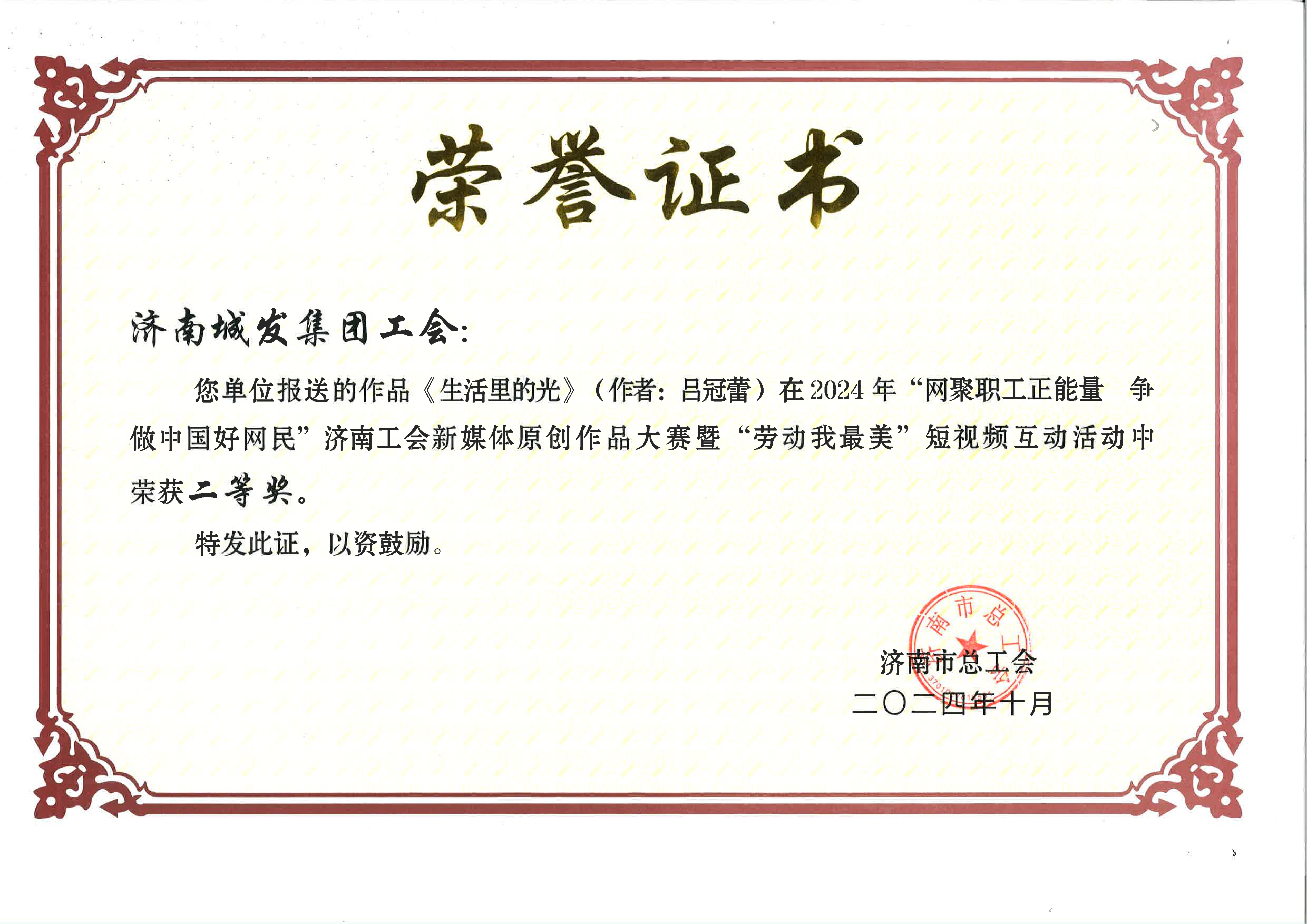 城發集團榮獲濟南工會新媒體大賽“勞動我最美”短視頻互動活動二等獎
